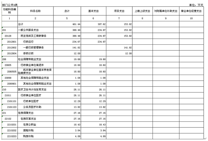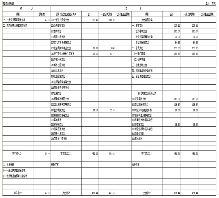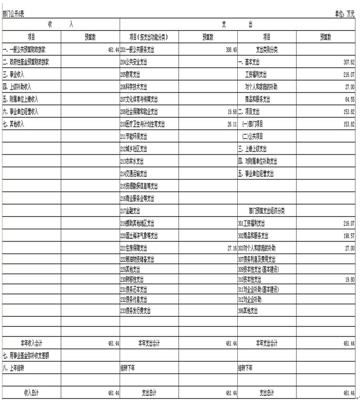 2018年财政拨款收支总预算461.44万元。收入包括:一般公共预算财政拨款本年收入461.44万元。支出包括:基本支出307.62万元,项目支出153.82万元。