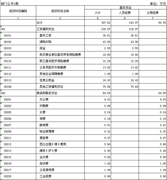 (一)基本支出307.62万元,主要用于人员经费(工资福利支出、对个人和家庭补助支出)、公用经费(商品和服务支出)。