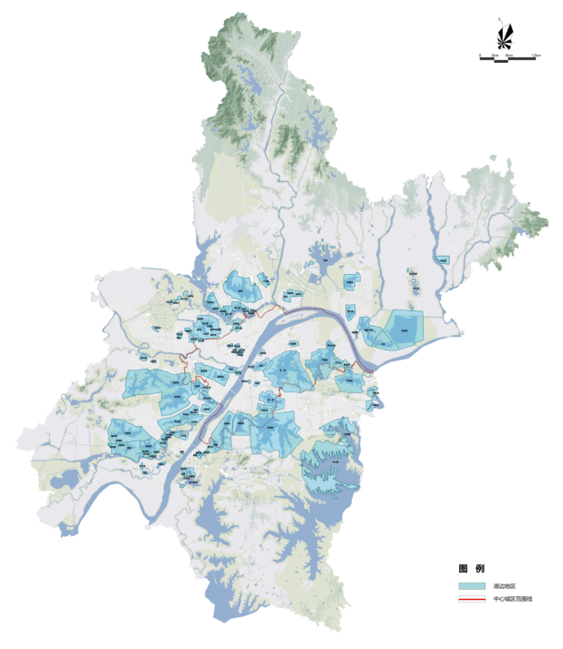 湖边地区以湖泊蓝线为基础,结合视距及城市道路确定(附图1-2)。