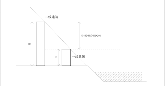 第七条 江边及湖边地区建设项目中的一线与二线公共及住宅建筑布局应前低后高,建筑高度之间差值应不少于20%(附图2)。