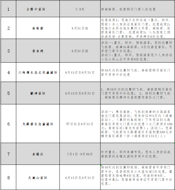 7. 武陵峡口生态旅游区、峡州清江天龙湾旅游度假区、长阳清江方山景区:凭抵达宜昌市高铁站的高铁票,享受成人票门票5折优惠。