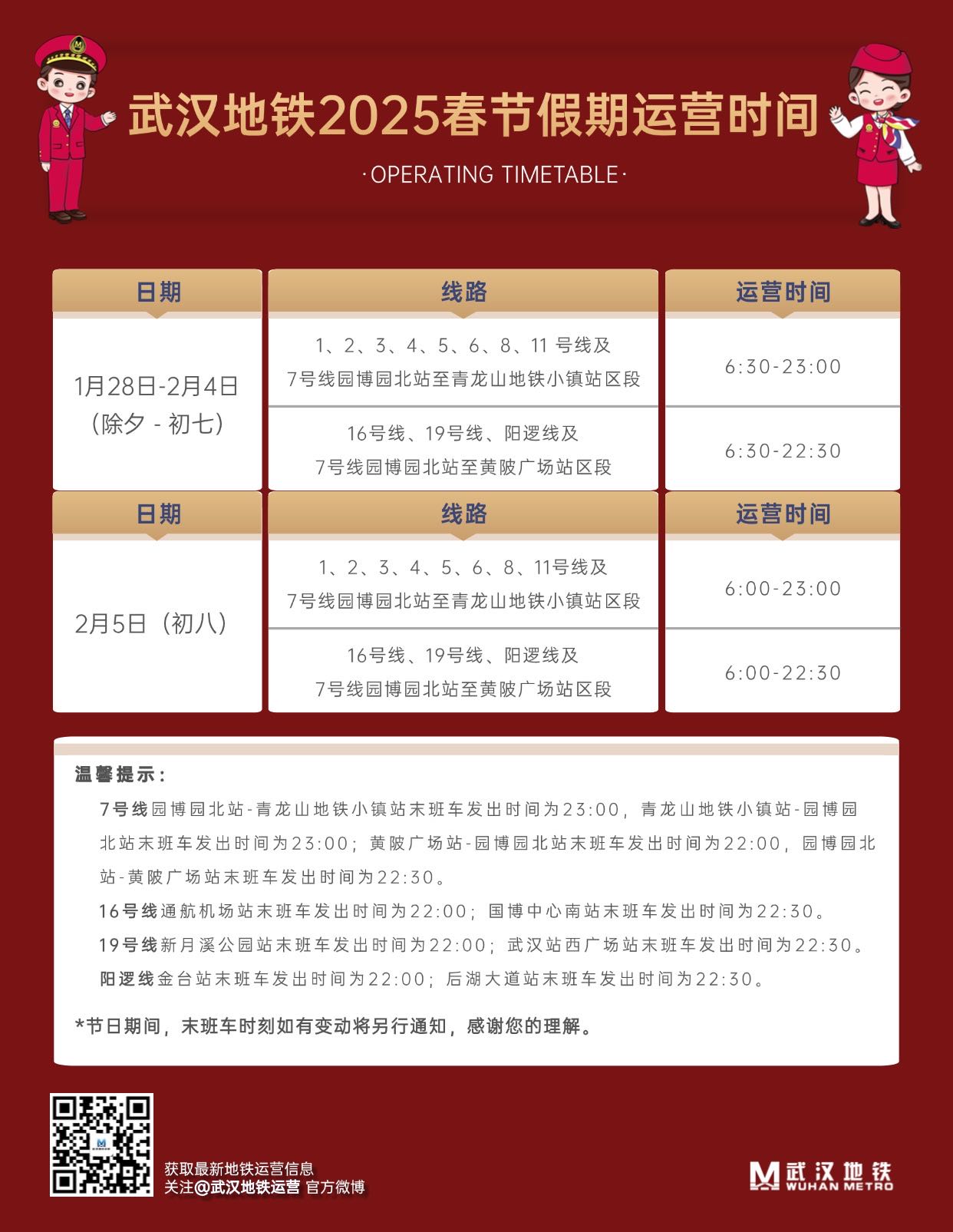 1月26日,长江日报记者从武汉地铁运营获悉,2025春节假期即将到来,武汉地铁公布春节运营时间,详情如下: