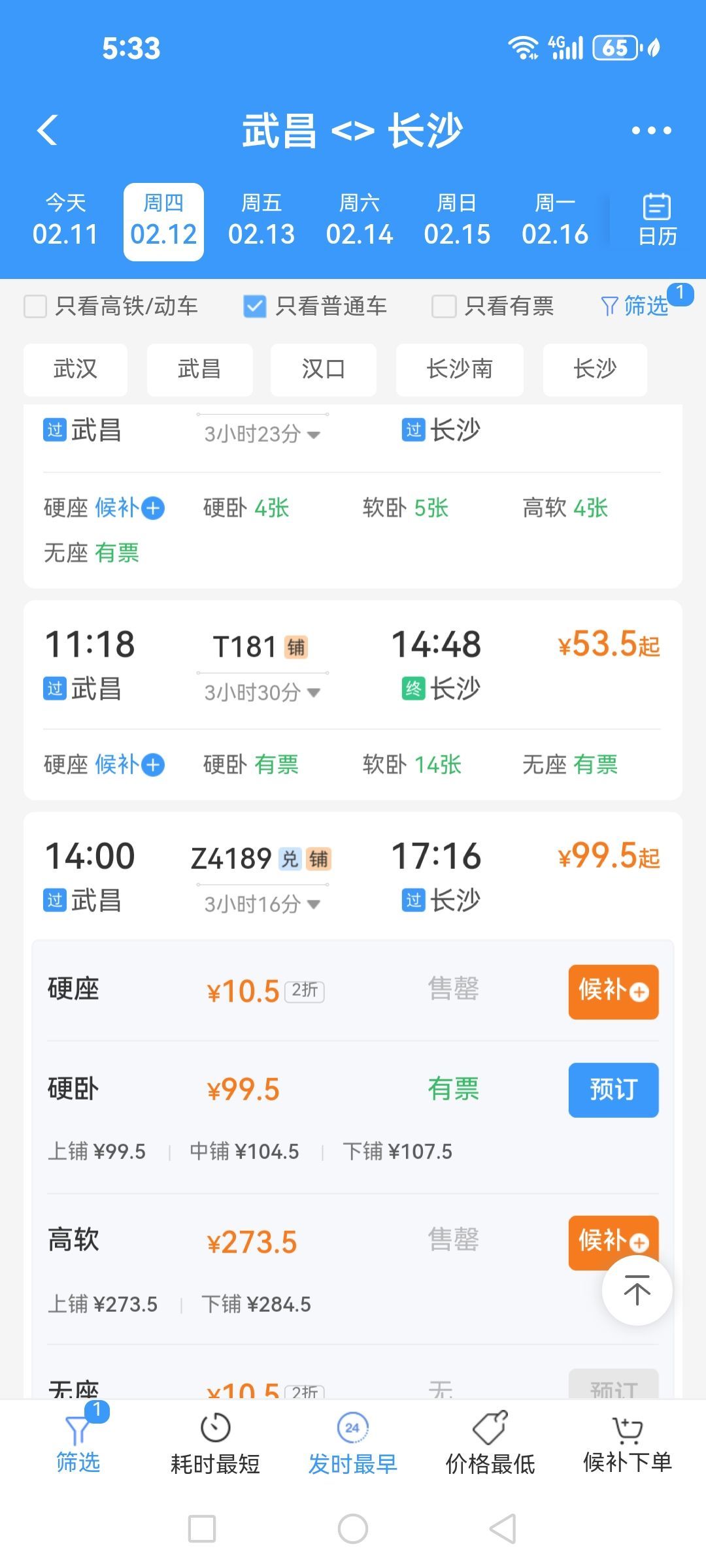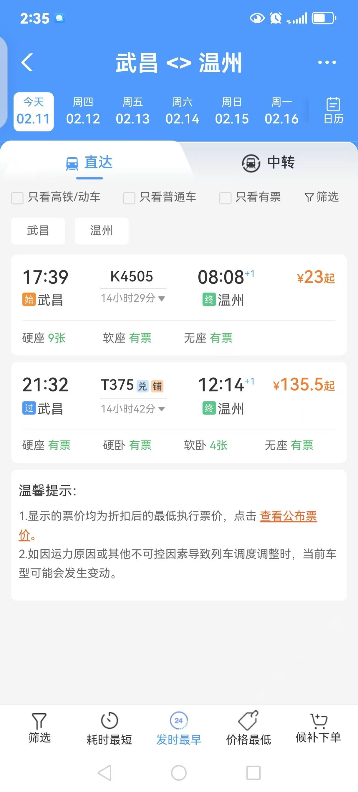 比如节前,2月10日至16日K822次信阳至深圳东硬座打2折、全程42.5元,2月11日至2月14日D4420次宜昌东至上海虹桥二等座打3折、全程149元。武汉至长沙方向:如Z4189次列车(武昌至长沙),硬座和无座票价为10.5元,相比原票价享受2折优惠。武昌至温州的K4505次二等座打2折,全程23元。