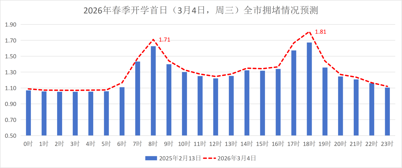 早高峰送学车流将提前至7时20分,持续至9时30分,拥堵高峰时刻预计出现在7时45分左右。晚高峰期间,因家长接学停车等待,学校周边道路在17时至18时拥堵加剧,部分初高中周边交通压力将持续至19时。