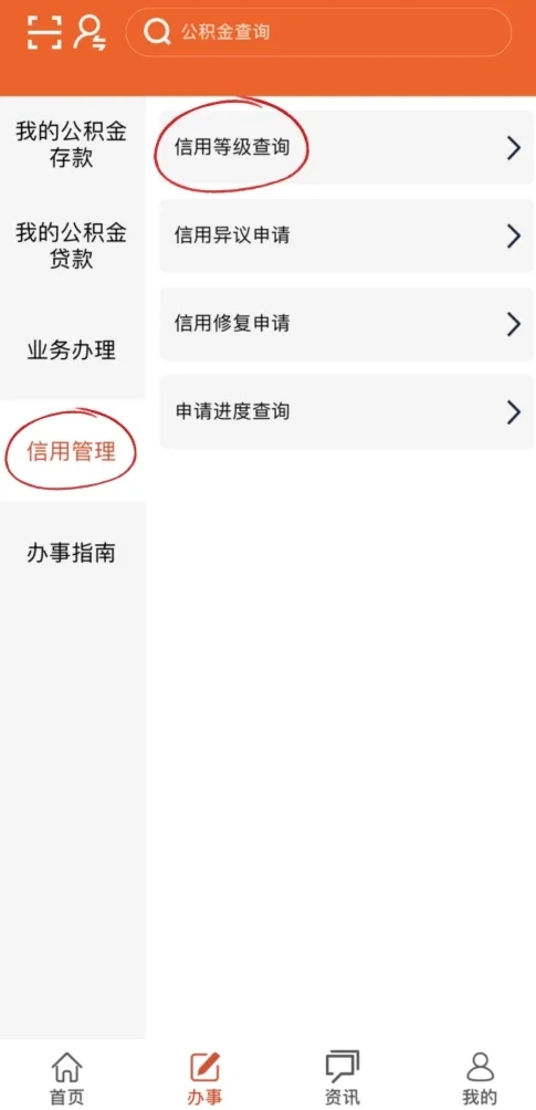 01 打开并登录武汉住房公积金APP,点击“办事”,选择“信用管理-信用等级查询”;