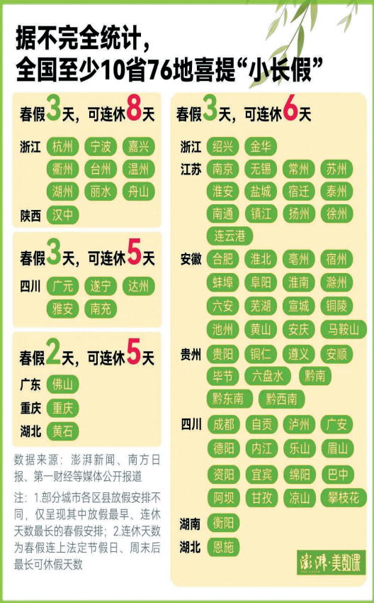 截至3月30日,据不完全统计,全国已有浙江、江苏、安徽、四川等十余个省份、76个地方明确了今年春假的具体时间安排。各地根据自身情况,通过与清明、五一、周末等时间衔接,将假期延长为4—8天的“小长假”。