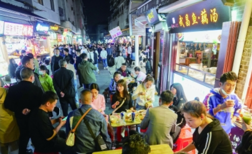 人们在武汉市著名的小吃街户部巷休闲消费。新华社记者程敏 摄