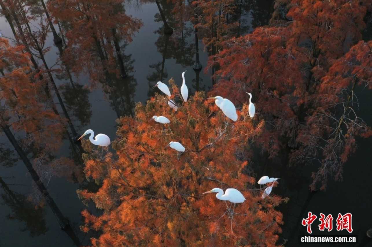 11月26日,湖北武汉,初冬时节,新洲区的涨渡湖水上森林公园迎来最美季节,万余棵池杉树树叶黄红相间,鹭鸟穿梭其间嬉戏觅食,形成“水中有树,树上有鸟,林鸟相依”的生态景观。