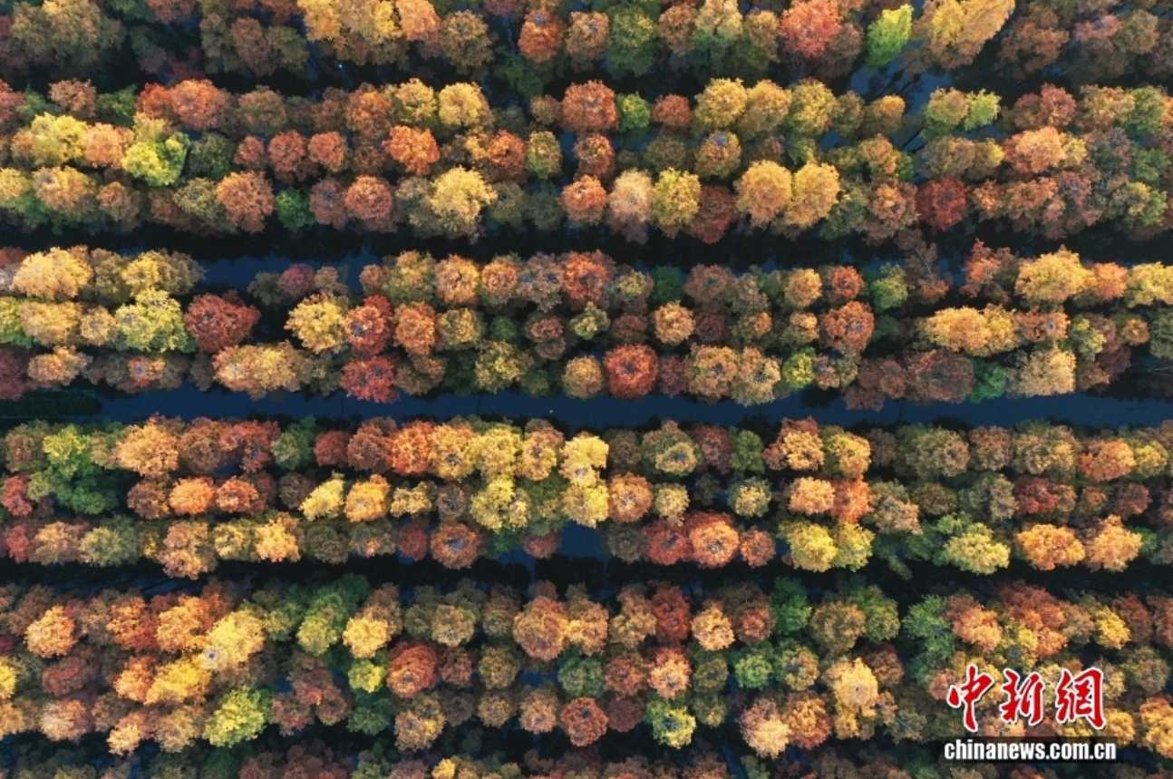 11月28日,湖北省武汉市新洲区,涨渡湖湿地公园万余棵池杉色彩斑斓,黄红相间,林在水中,鸟在林中,林水相依的水上森林宛如水彩画卷,吸引各地游人观光打卡。