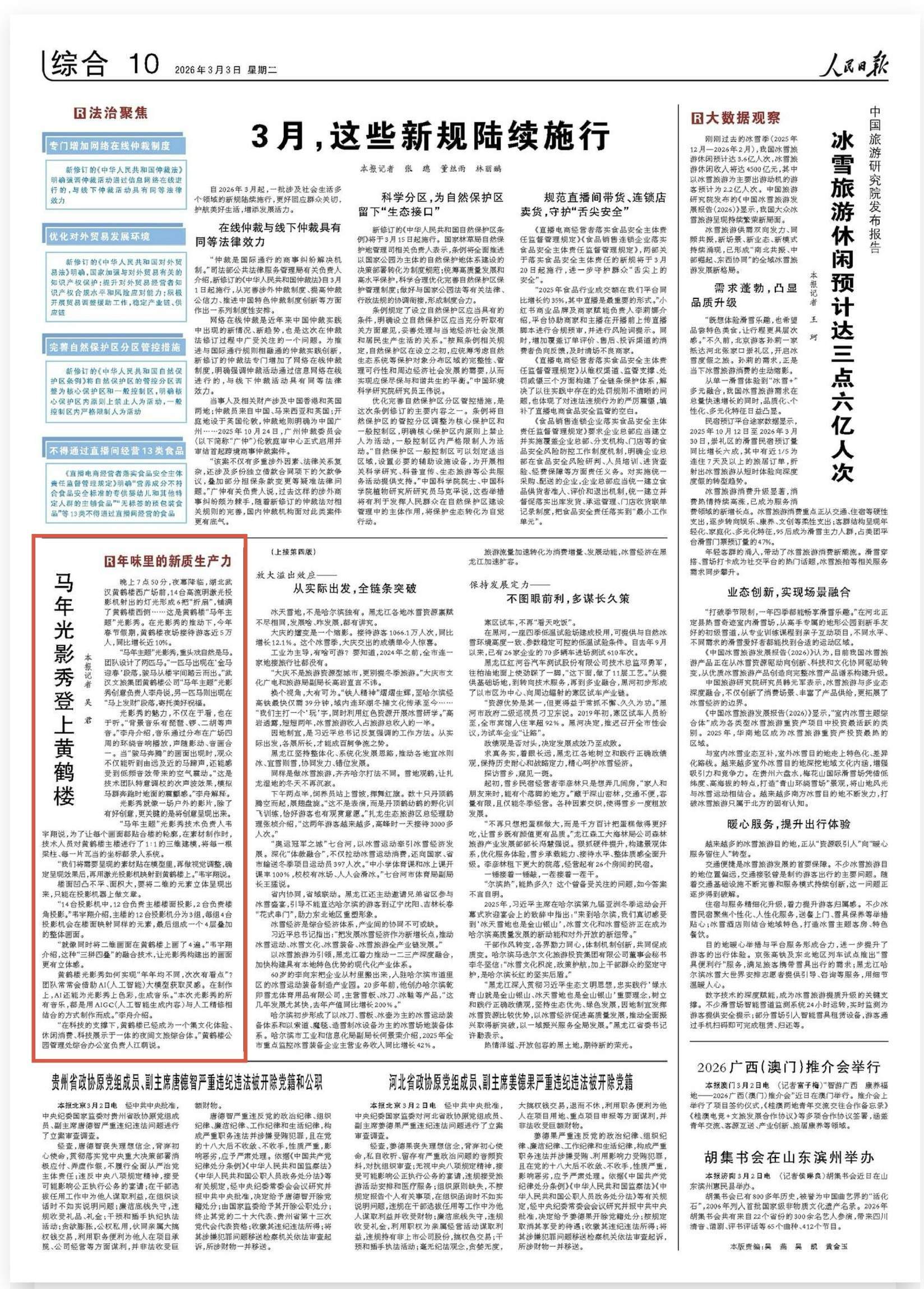 晚上7点50分,夜幕降临,湖北武汉黄鹤楼西广场前,14台高流明激光投影机射出的灯光形成6把“折扇”,铺满了黄鹤楼西侧……这是黄鹤楼“马年主题”光影秀。在光影秀的推动下,今年春节假期,黄鹤楼夜场接待游客近5万人,同比增长近10%。