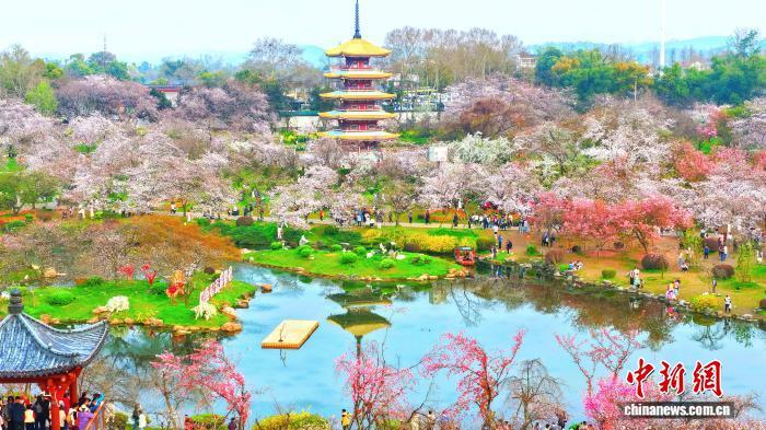 武汉东湖樱花园万余株樱花迎来盛花期。(无人机照片) 周星亮 摄