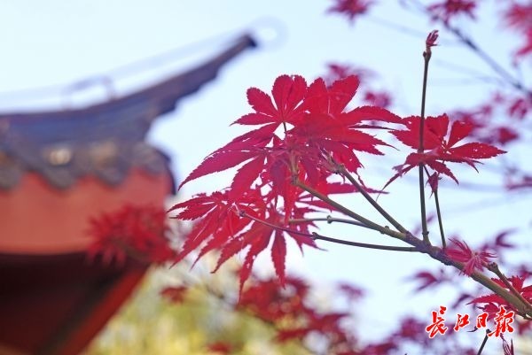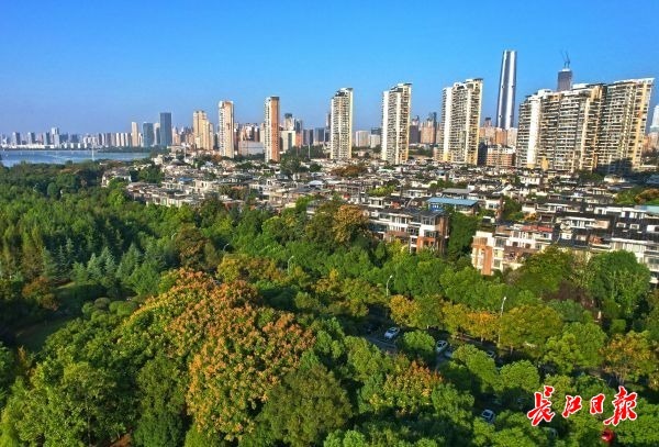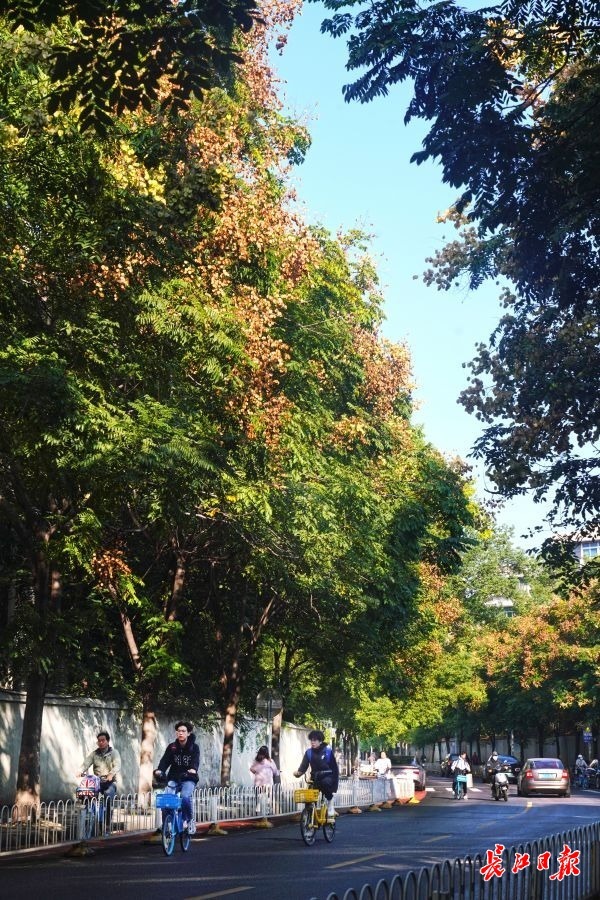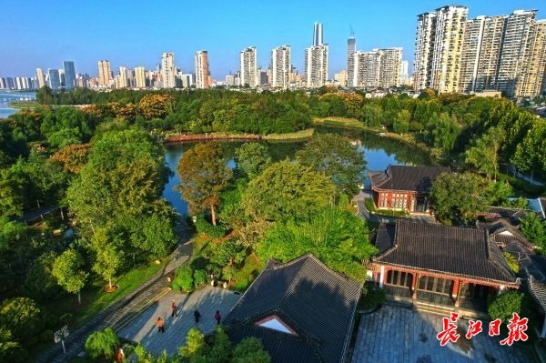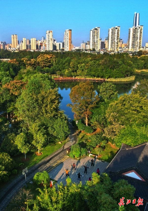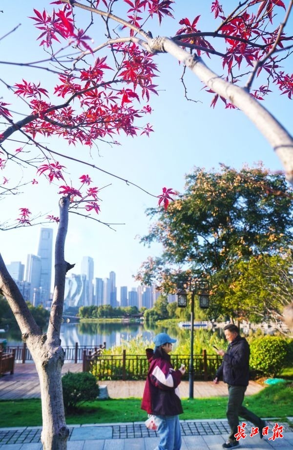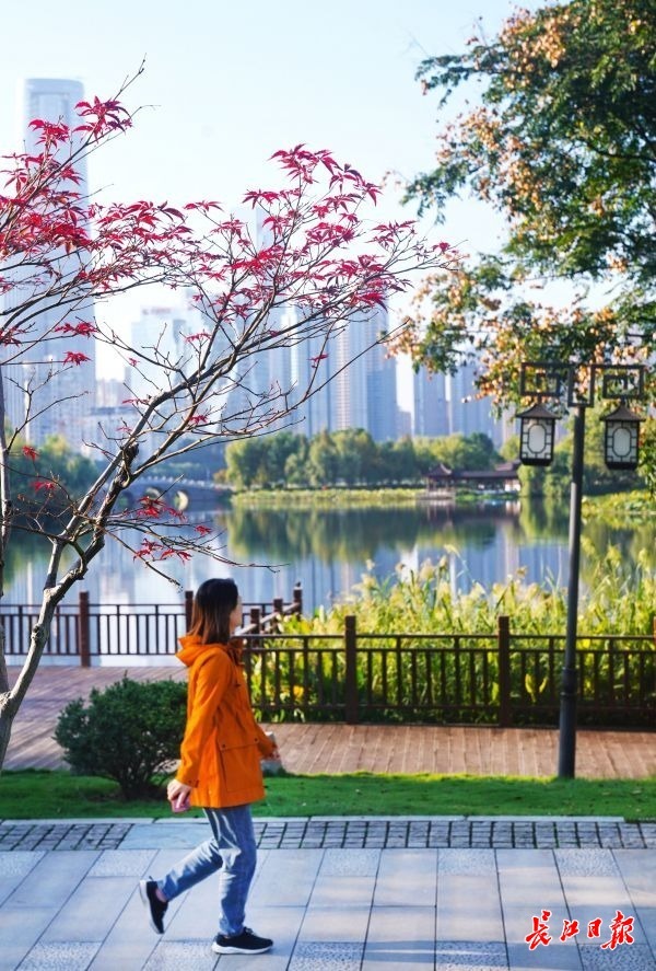 2025年10月22日,江城雨后放晴,武昌沙湖公园周边秋意渐浓,市民在斑斓的树叶间漫步晨练。