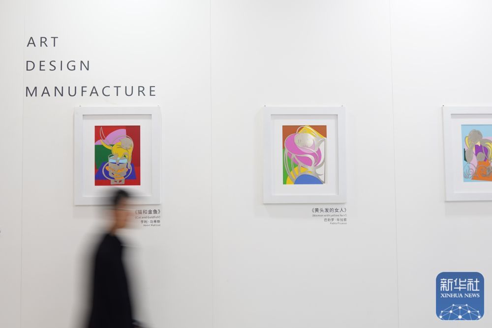 11月6日,一名参观者路过华工科技激光科技馆内由激光技术二次创作的绘画作品