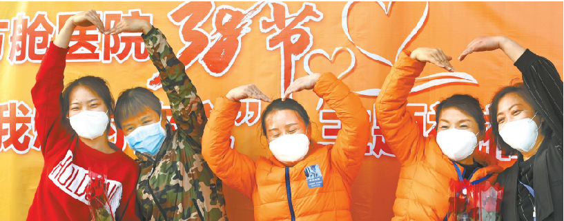 3月7日,武汉客厅方舱医院广场上,不少女医护人员收到了玫瑰花,她们在下班后摆出各种造型拍照留念。