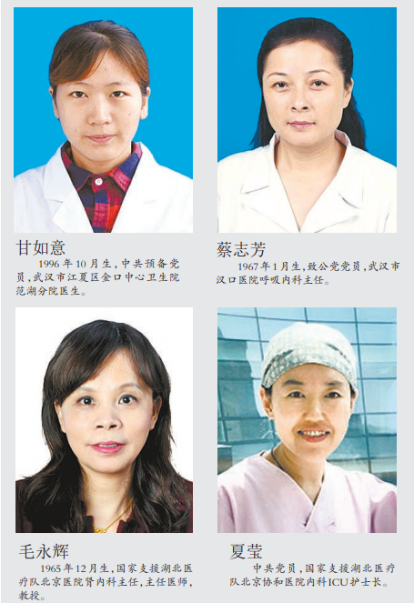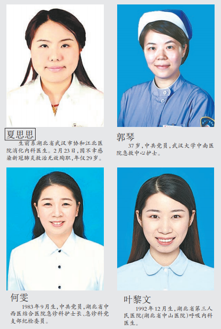 此次发布的“一线医务人员抗疫巾帼英雄谱”共20人。有6位湖北抗疫一线女医务人员,她们是:生前任湖北省武汉市协和江北医院消化内科医生夏思思;武汉大学中南医院急救中心护士郭琴;湖北省中西医结合医院急救科护士长何雯;湖北省第三人民医院呼吸内科医生叶黎文;武汉江夏区金口中心卫生院范湖分院医生甘如意;武汉市汉口医院呼吸内科主任蔡志芳。