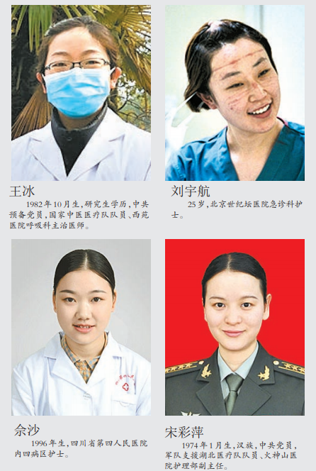 有7位国家及各地支援湖北女医务人员,她们是:国家支援湖北医疗队北京医院肾内科主任毛永辉;国家支援湖北医疗队北京协和医院内科ICU护士长夏莹;国家支援湖北医疗队中日友好医院大外科科护士长、支援湖北重症护理队队长赵培玉;国家中医医疗队队员、广安门医院护理部副主任郭敬;国家中医医疗队队员、西苑医院呼吸科主治医师王冰;北京世纪坛医院急诊科护士刘宇航;四川省第四人民医院内科四病区护士佘沙。