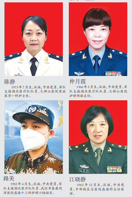 有5位军队支援湖北女医务人员,她们是:军队支援湖北医疗队队员、火神山医院护理部副主任宋彩萍;军队支援湖北医疗队队员、火神山医院重症医学一科护士长陈静;军队支援湖北医疗队队员、火神山医院护理部副主任仲月霞;军队支援湖北医疗队队员、武汉市泰康同济医院感染十三科护理六组组长路美;中部战区总医院感染科主任医师江晓静。