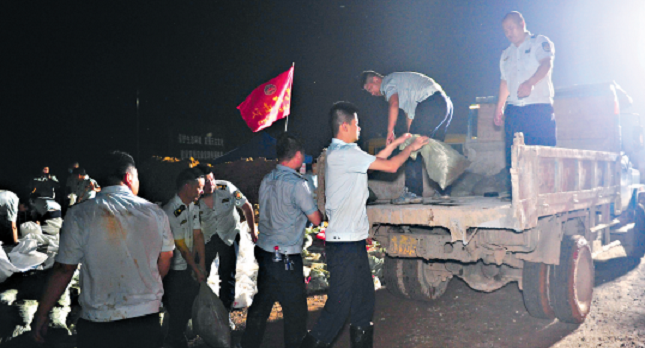 17日晚,武汉东西湖区东风垸堤出现散浸,防汛突击队紧急开挖沟渠引流,搬沙袋堵住出水点。