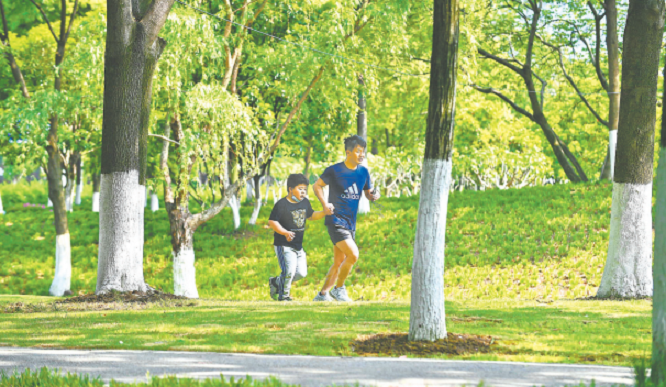 见缝插绿,在武汉已成文明创建共识。市民身边的绿色越来越多,生活更加美好。图为市民在范湖小森林绿道跑步。
