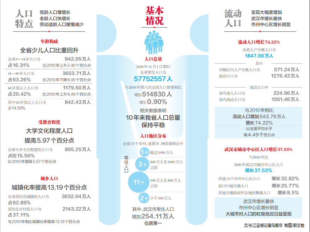 朱慧说,根据国务院人普办的统一部署,湖北省人口普查公报5月26日正式发布。普查公报共有6个,分别为全省人口情况、地区人口情况、人口性别构成情况、人口年龄构成情况、人口受教育情况、城乡人口和流动人口情况。