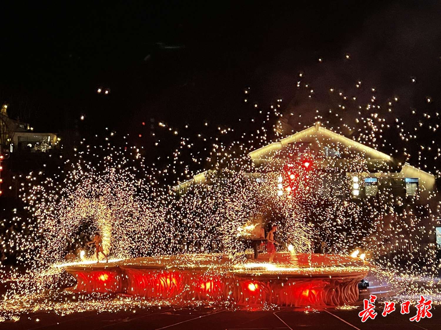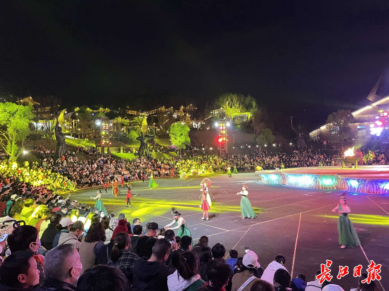 看完演出后,长江日报记者看到不少游客选择乘坐园区小火车前往梦栖谷篝火广场,篝火广场背靠巫傩部落、松鼠王国森林酒店,亮化后整个山体熠熠生辉。舞台前方光影璀璨,火把舞、非遗打铁花纷至沓来,随着音乐烟花秀上演,将当晚的气氛推向高潮,近万人在现场欢呼雀跃。洪先生一家四口特地从光谷驱车来参加木兰草原的夜场活动,洪先生说:“近十年没有来木兰草原了,没想到变化这么大,烟花飞上天空真的太治愈了。”
