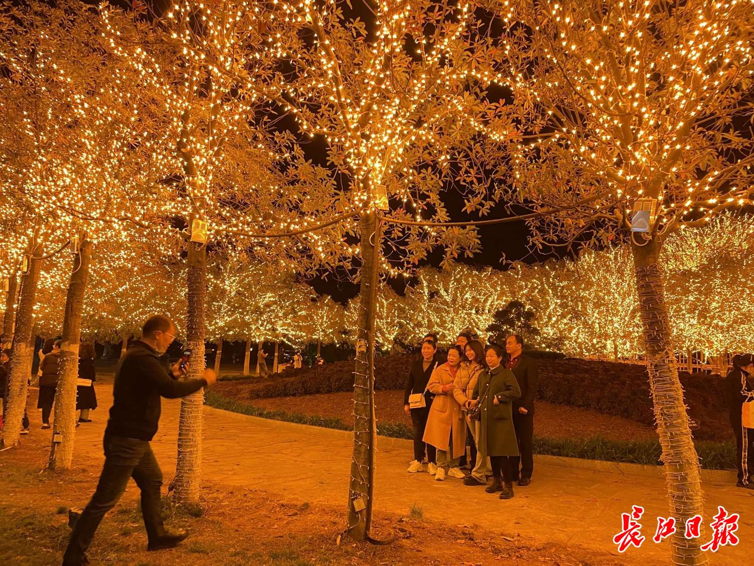 市民游客在木兰草原火树银花下合影