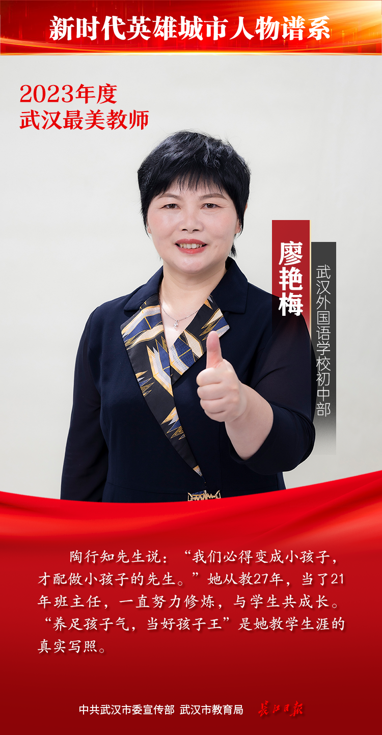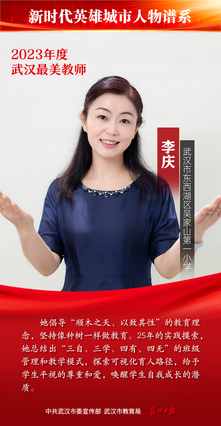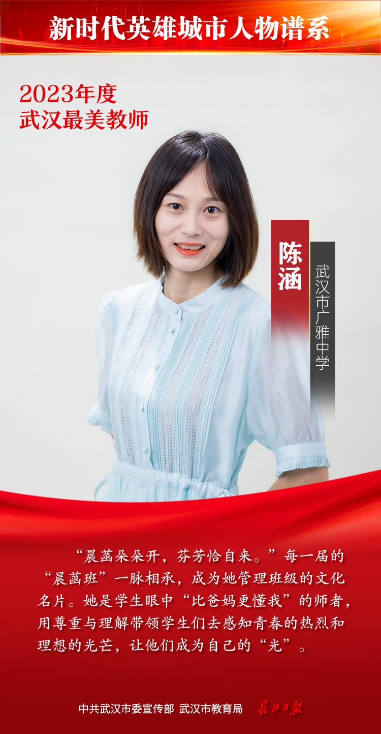 教师是立教之本、兴教之源。为发掘宣传基层优秀教师典型,彰显新时代人民教师的理想情操、高尚师德和人格魅力,教师节前夕,由中共武汉市委宣传部、武汉市教育局主办,长江日报承办的2023年度武汉最美教师评选活动落幕,综合网络投票情况和专家组评审结果,最终20位教师获“武汉最美教师”称号。