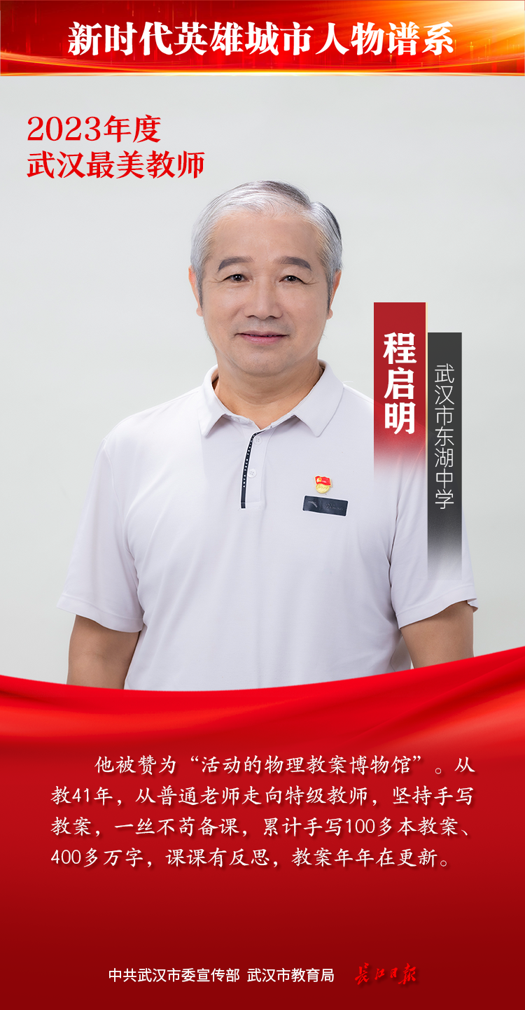 他被赞为“活动的物理教案博物馆”。从教41年,从普通老师走向特级教师,坚持手写教案,一丝不苟备课,累计100多本教案,400多万字,课课有反思,教案年年在更新。