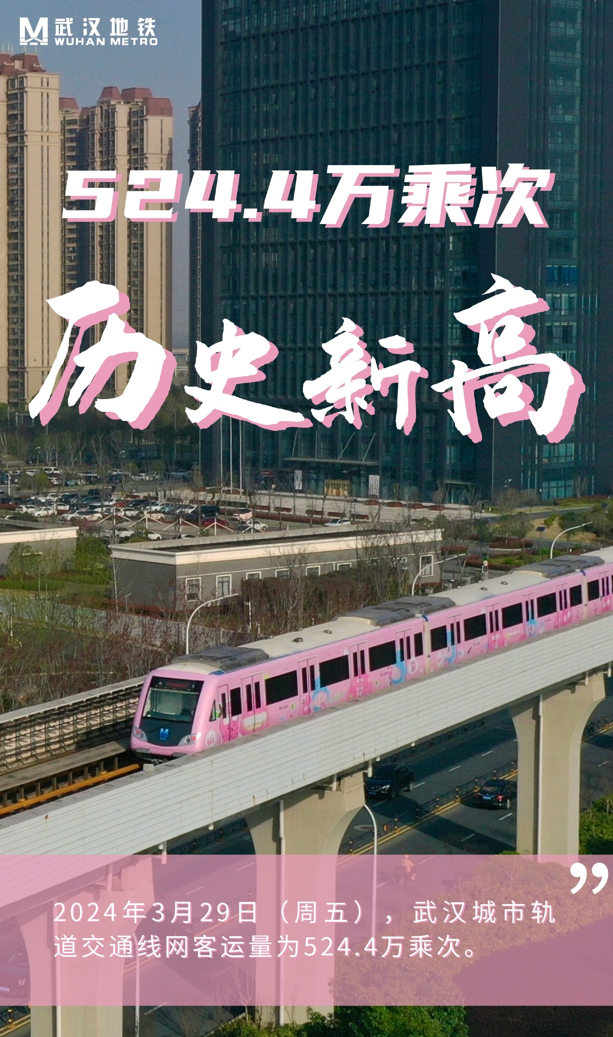 2024年3月29日(周五),武汉城市轨道交通线网客运量(含换乘)为524.4万乘次,打破2023年9月28日创造的521.45万客流纪录。
