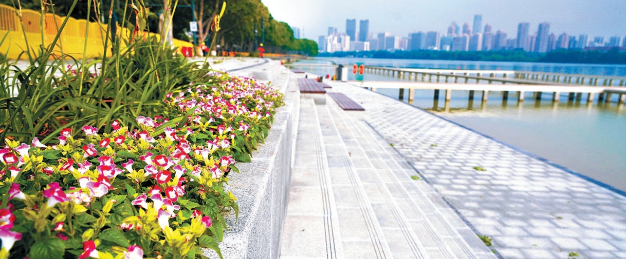 湖岸拆除破旧的滨水台阶和铺装后,重建了亲水平台和观景台阶。台阶有上、下两层步道,与两端的缓坡栈道相连。石阶旁的花坛内种植了花草。坐在岸边,可以毫无遮挡地观赏东湖的湖光山色。