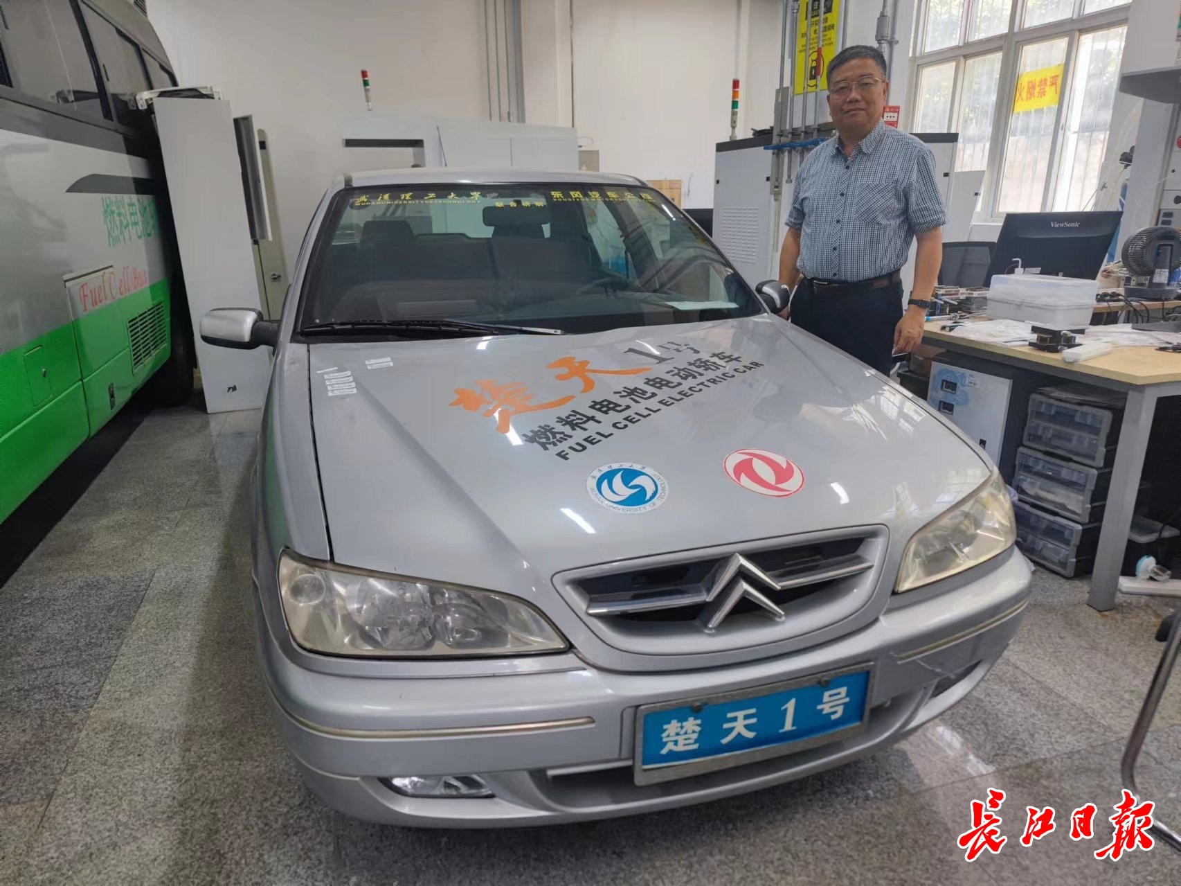2005年,武汉理工大学与东风汽车公司联合研发“楚天一号”,这是我国首批两台氢燃料电池轿车之一。图为潘牧与“楚天一号”合影。 长江日报记者汪洋 摄
