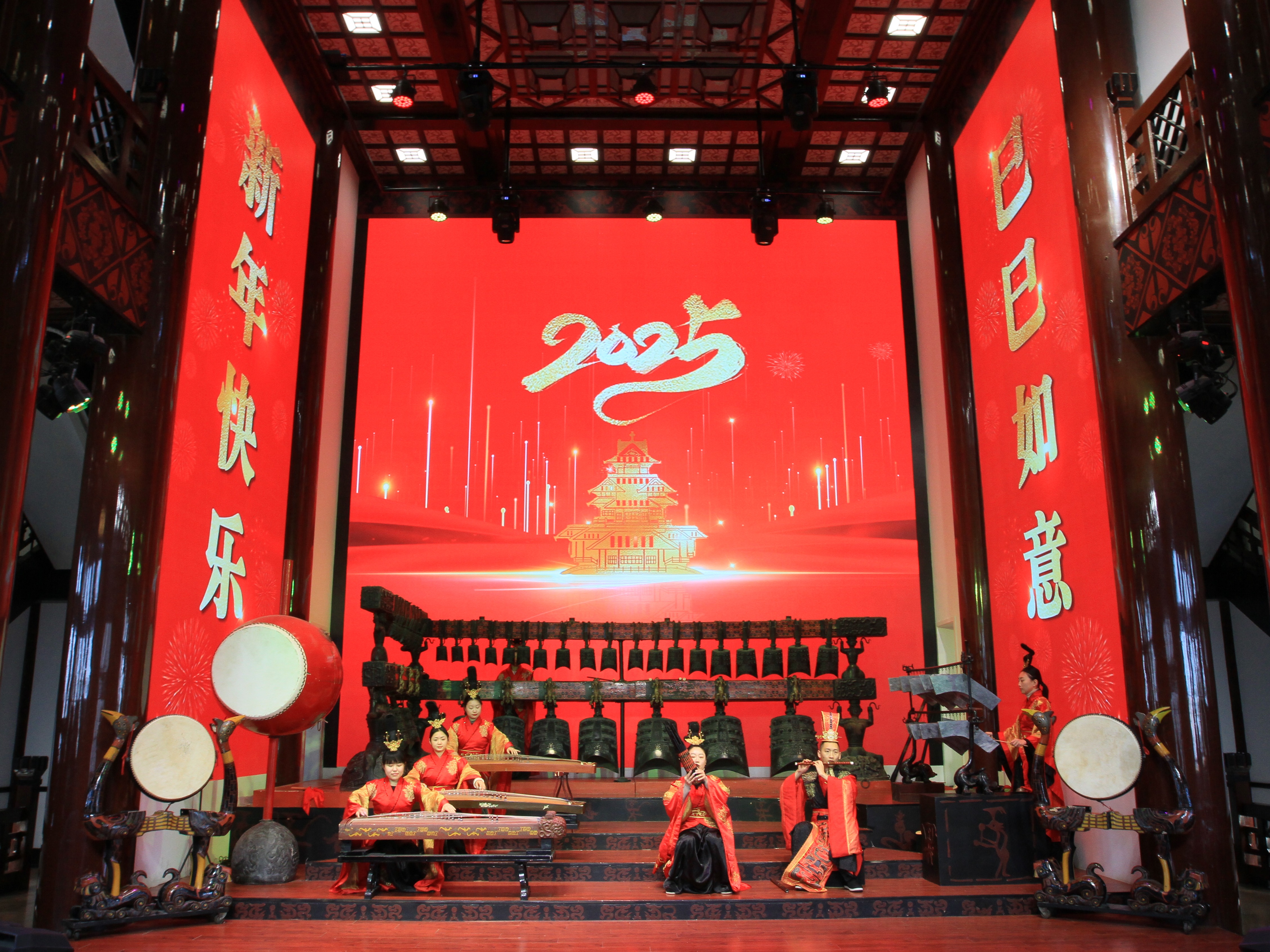 上午9点半,编钟古乐演奏大厅座无虚席,《秦王破阵乐》《宴飨圣乐》等乐曲连番上演,动态的舞台背景恢宏大气,磨山之巅再次奏响荆楚之音,引得现场游客掌声连连。演出结束后,马振邦走上舞台,拿起乐锤即兴敲击编钟,他说,我对历史古乐很感兴趣,编钟低音浑厚,高音响亮,亮相春晚恢弘壮观,非常吸睛。