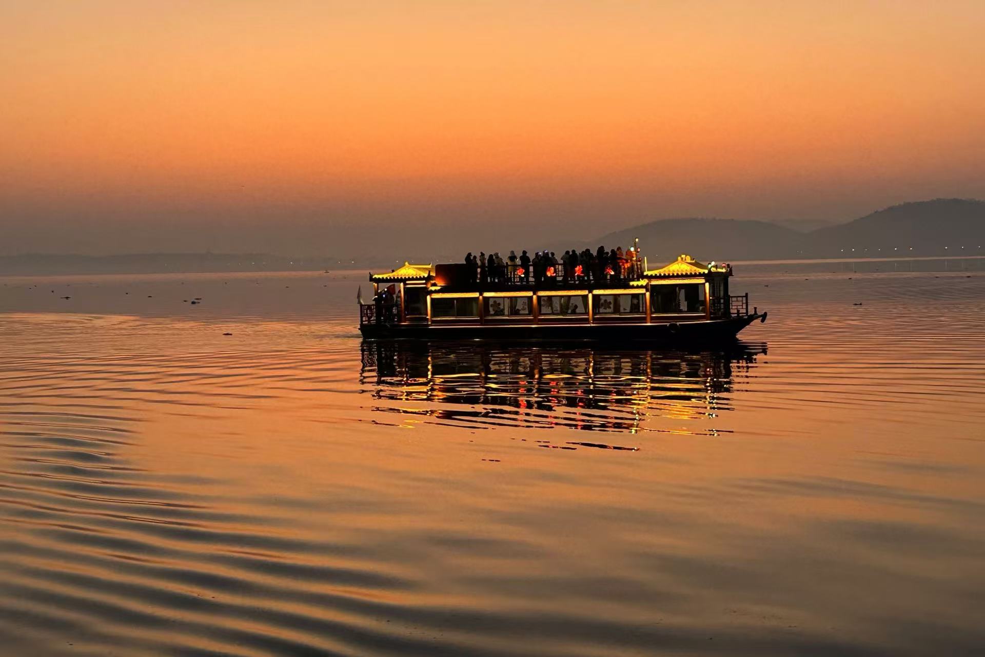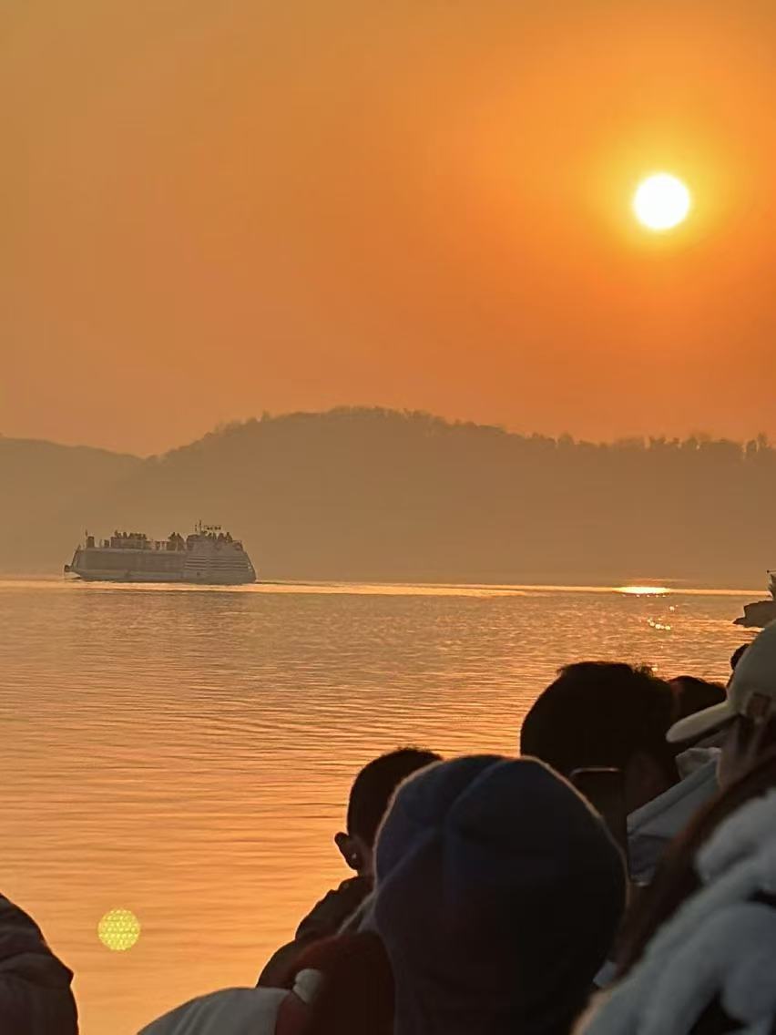 6:22,当第一缕金辉刺破云层,人群中爆发出惊叹。来自成都的大学生王雨凡和朋友倚靠在凌波门一侧的平湖珞樱驿站观景台栏杆处,发梢被染成琥珀色,“网上刷到过好多次武汉凌波门的日出,现场看更是震撼十倍,湖面像撒了把碎钻,太美了。”6:30,位于平湖珞樱驿站的凌波门码头,东湖游船航线正式首航。安徽游客刘昕带着女儿率先登船,透过船舱玻璃,玫瑰金的光瀑正漫过磨山轮廓,几只红嘴鸥正掠过泛着金光的水面,坐在窗边的刘昕举起手机连按快门。“孩子从没见过湖上日出,我们已经开始期待一会儿的樱花之旅了,正好错峰出行,这趟早起太值了!”