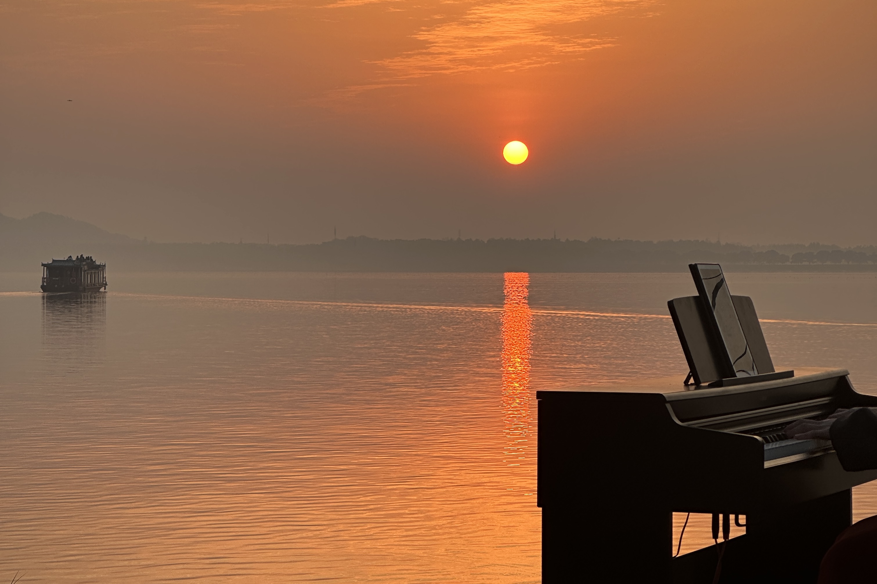 驿站观景平台上,演奏者在钢琴前落座,温柔的旋律随晨风流淌,与游船启航的汽笛声交织成春日序曲,游客们坐在驿站台阶上,一边听音乐,一边欣赏着日出。“面对这么美的山水,在日出的时候,我们为游客增加一份仪式感,希望琴键敲开的不只是清晨,还有城市人对自然的诗意想象。”湖山咖啡品牌负责人介绍,即日起,东湖绿道三期平湖珞樱驿站处每天上午6:00至7:30将会为游客带来乐队演出,后期还会增加其他乐器,让声景更有层次。