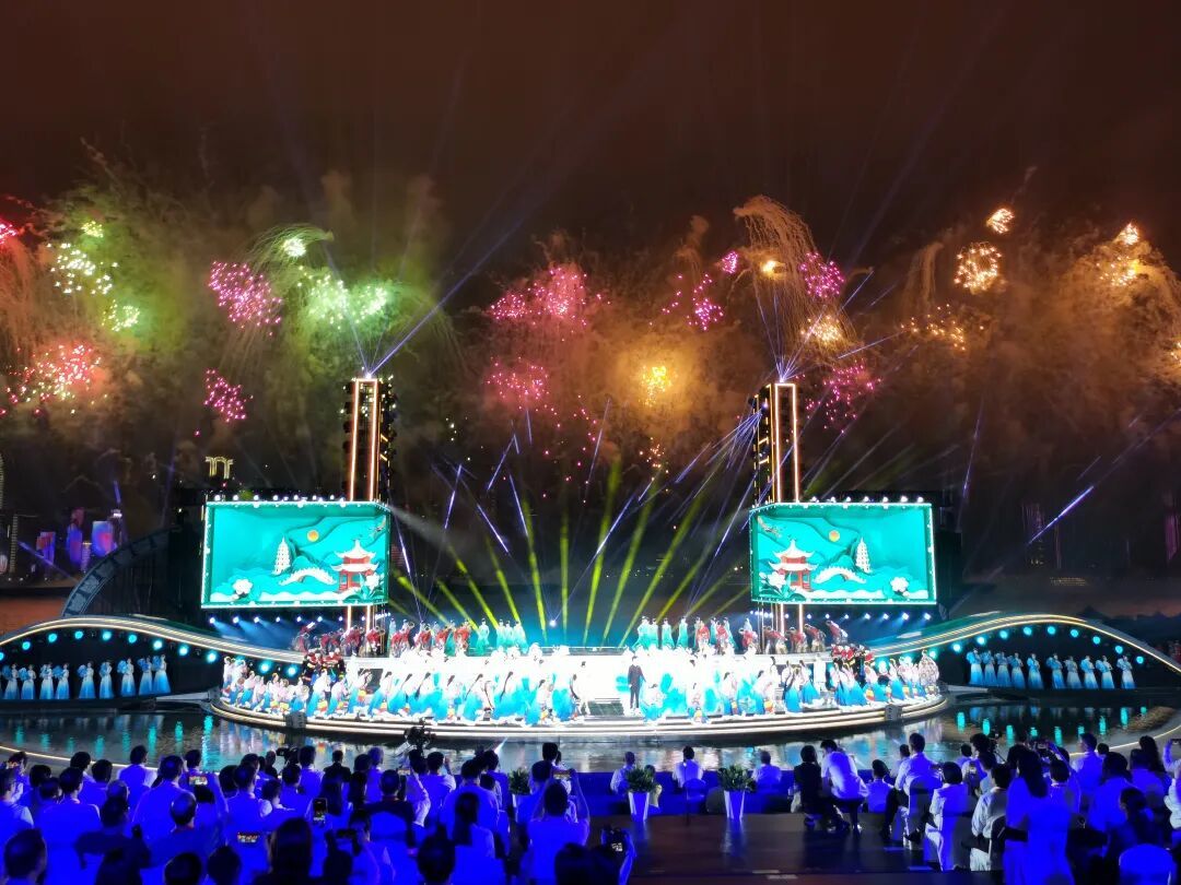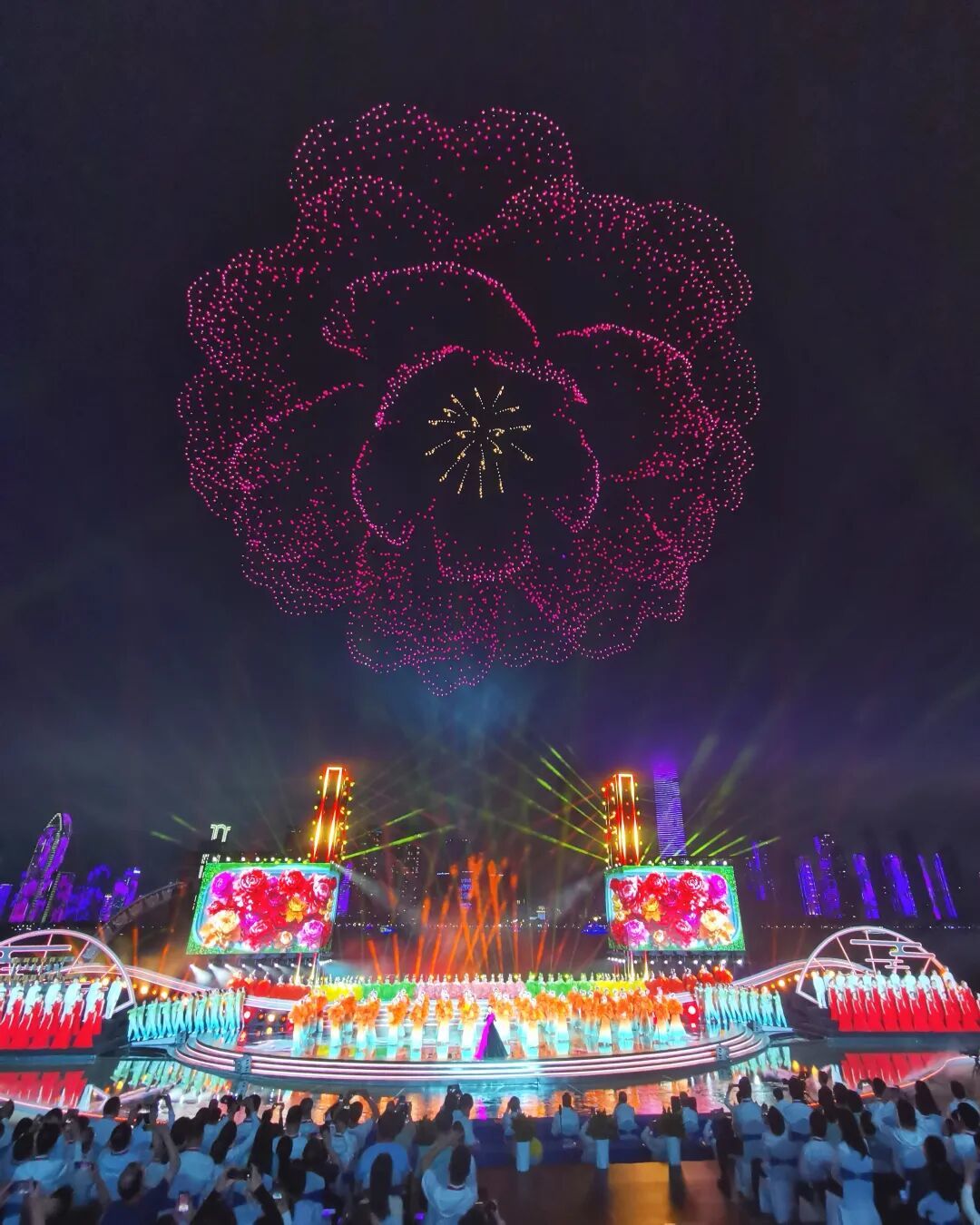 武汉馆上演《星汉耀江城》大秀,身着华美服饰的人形机器人和演员一起跳起凤凰舞。