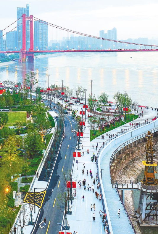 漫步亲水廊道,触摸锈迹斑斑的系船柱,眺望橘红色的鹦鹉洲大桥,仿佛能看见历史的长河与眼前奔流的长江在此交汇。昔日封闭的生产岸线,如今已成为市民触摸文脉、观江览胜的开放空间,标志着整个廊道从规划蓝图变为贯通现实的最终完成。