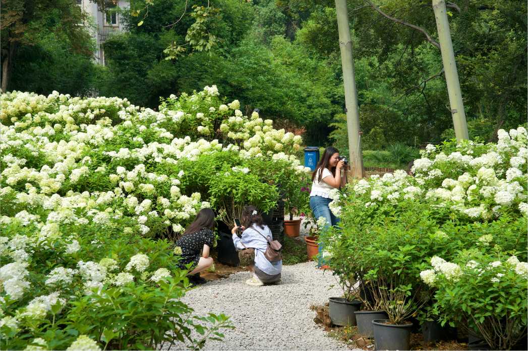 “这简直就是‘奶油冰激凌’!”游客杨女士和同伴一边在圆锥绣球花海里拍照一边感叹。1500株圆锥绣球在阳光的照耀下显得分外迷人,层层叠叠的细碎小花编织成硕大的圆锥形花序,清新的奶油白与浅绿色配色,让圆锥绣球宛若一个个冰激凌甜筒,清新可爱。“随着昼夜温差变大,圆锥绣球会逐步从浅绿色转为粉红色甚至深红色,上演流动的色谱。”武汉植物园相关负责人表示。