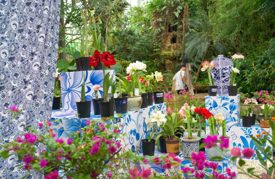 除上新的1500株圆锥绣球外,硫华菊与百日草共织5000平方米多巴胺花海在国庆假期也迎来盛放高潮,暖橙色、明黄色与大红色的花朵如织锦般铺展,在湖光映照下翻涌成斑斓花浪,营造活力盎然的秋日花园。景观温室内,51个品种的朱顶红在青花瓷纹样展陈中绽放,传递“鸿运当头”的吉祥寓意。上海游客林女士抚摸着花瓣说:“这些朱顶红真喜庆,我要拍段视频给爸妈看!”
