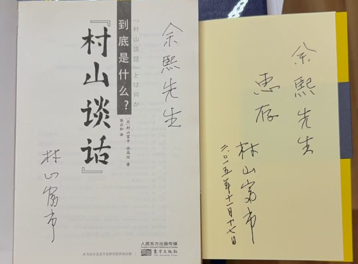 2013年、2015年,村山富市给余熙的赠书。