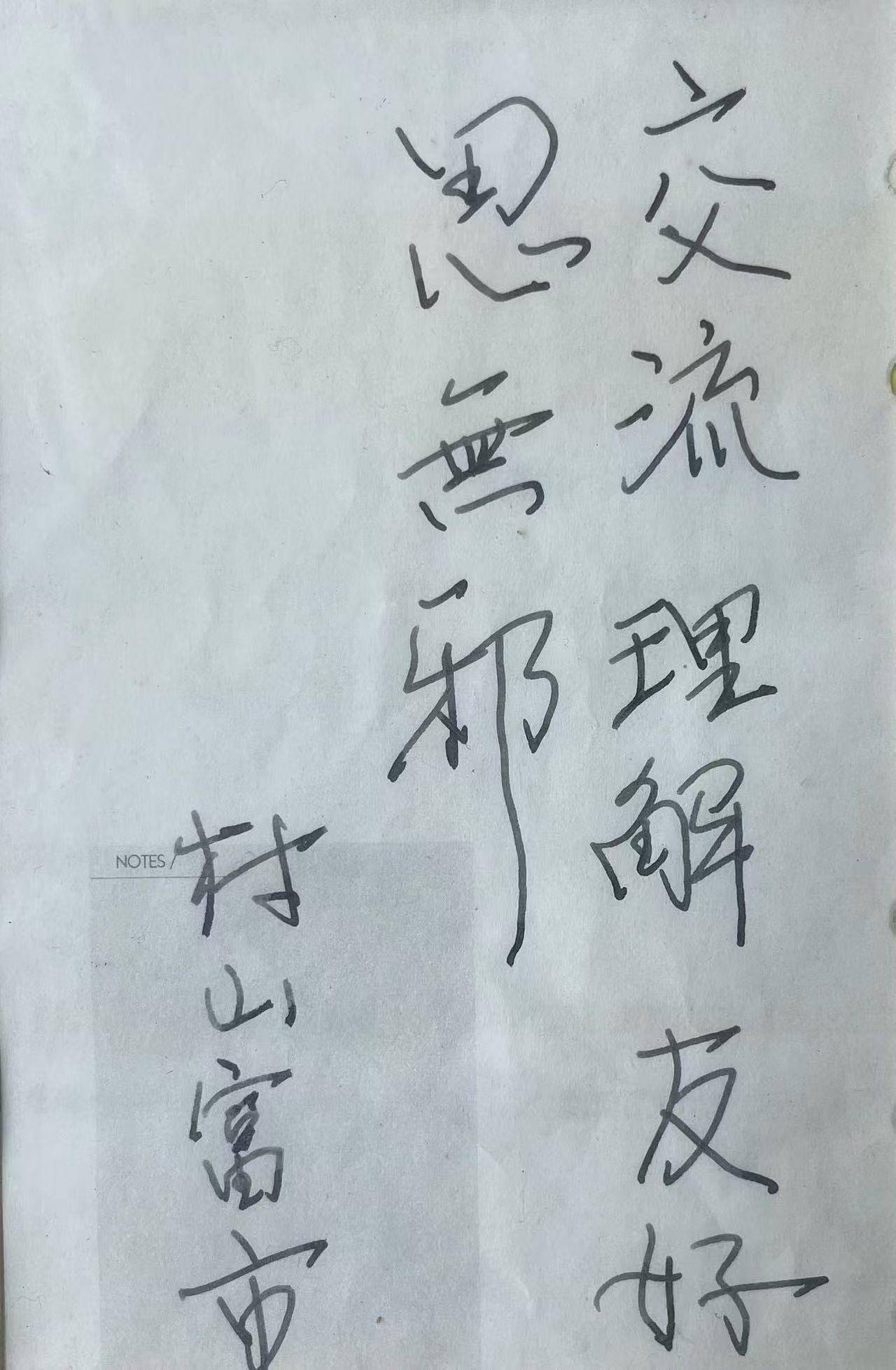 “这是我职业生涯开始不久的一次采访,也是我职业生涯最难忘的采访之一。”夏琼并不知道村山先生会写汉字。“采访最后,我请他在我的采访本上写下一句话,他思考了一会,就写下了这样一些内容。”“交流 理解 友好 思无邪”的赠言,一直被夏琼珍藏着。