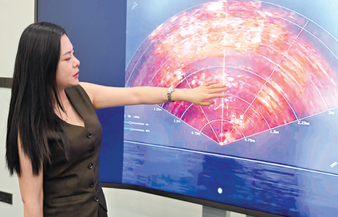 工作人员手中的显示屏上传来水中画面。彩色扇形立体图上,一片片星星点点的物体掠过,这是机器人拍摄到的水下环境和游过的鱼群。