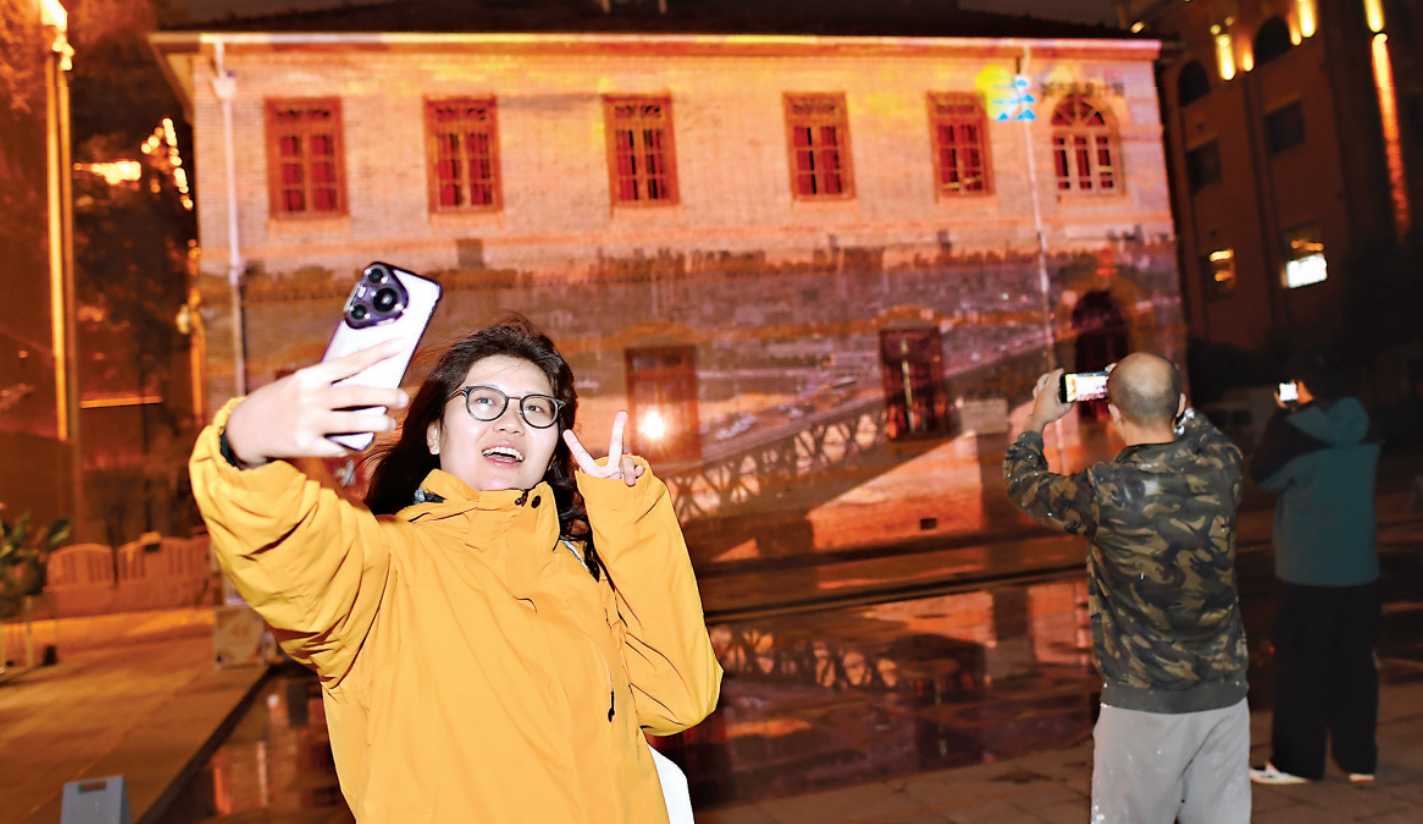 夜幕为纸,光影作笔。当四五十年前的武汉老照片“飞”上老房子,平和坊广场幻化成沉浸式光影空间,众多市民游客纷纷驻足,在光影中留影。