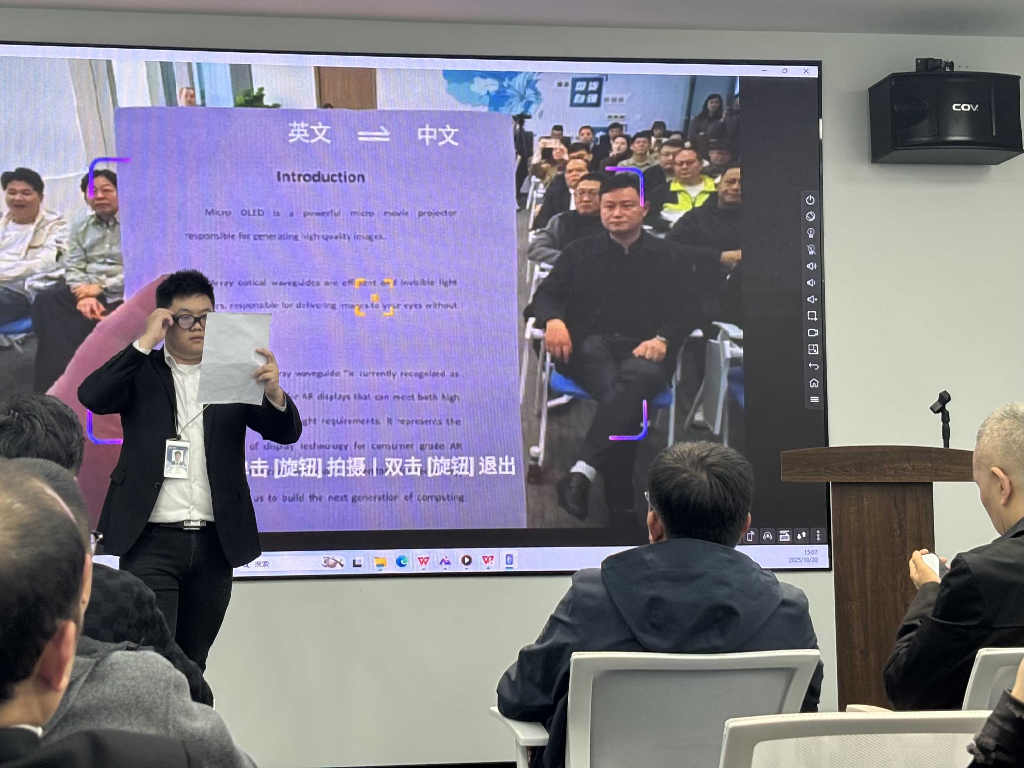 研发人员演示眼镜的拍照翻译功能。