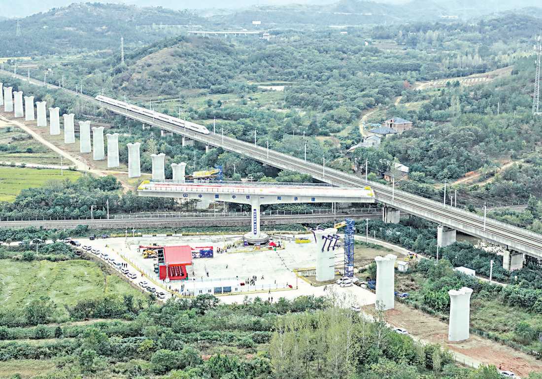 10月21日18时18分,在麻城市曹家坳村,沪渝蓉高铁合武段跨京九铁路特大桥66号墩T构转体连续梁,67分钟后成功跨越既有京九铁路,精准落在设计桥位上,顺利实现对接。