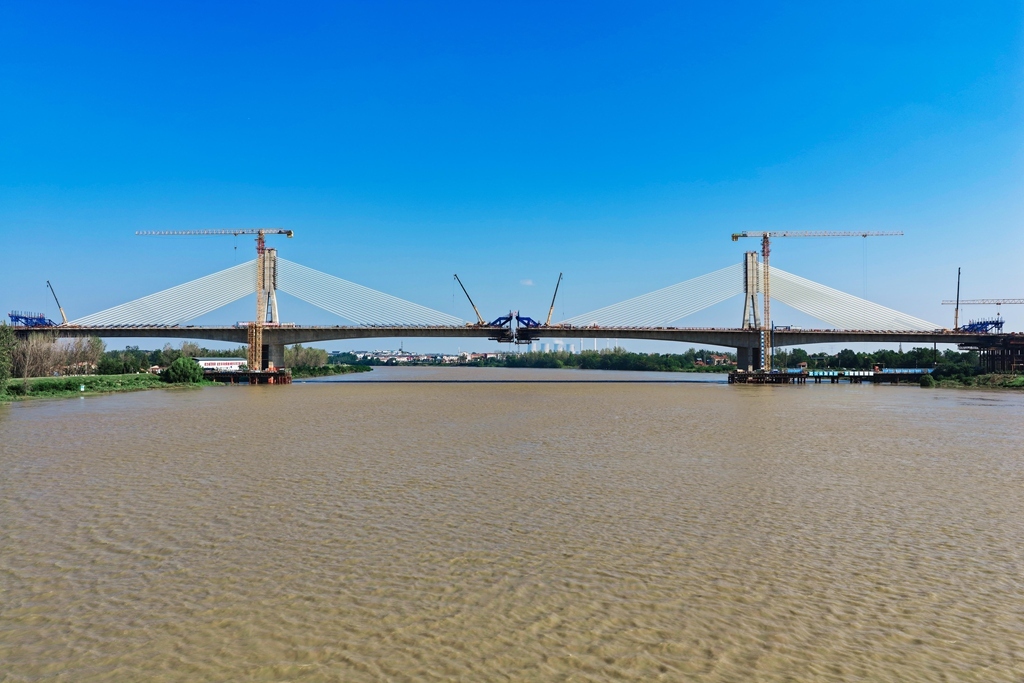 镜头切到正进行最后合龙冲刺的马口汉江特大桥。头戴黄色或蓝色安全帽、身着嫩绿色施工背心的工人,弓身锚定在桥面配合大型机器进行连续梁混凝土浇筑和绑扎顶板钢筋。不远处,明黄色塔吊长臂轻旋,将桥下货车上的钢筋、模板捆扎成“钢铁束”,稳稳吊运至桥面作业点。