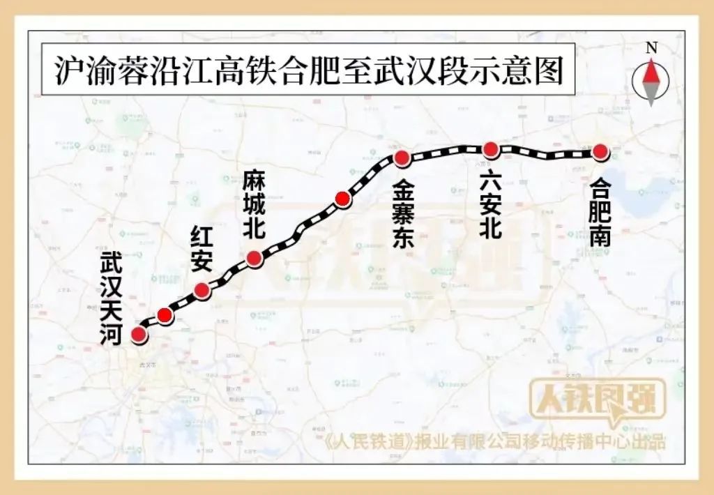 沪渝蓉高铁合武段是我国“八纵八横”高铁网沿江通道的重要组成部分,设计时速350公里。线路建成后,上海、南京方向的高铁列车可借此直达武汉、重庆、成都,武汉至合肥将由目前的2小时缩短至1小时,将极大便利沿线群众出行。