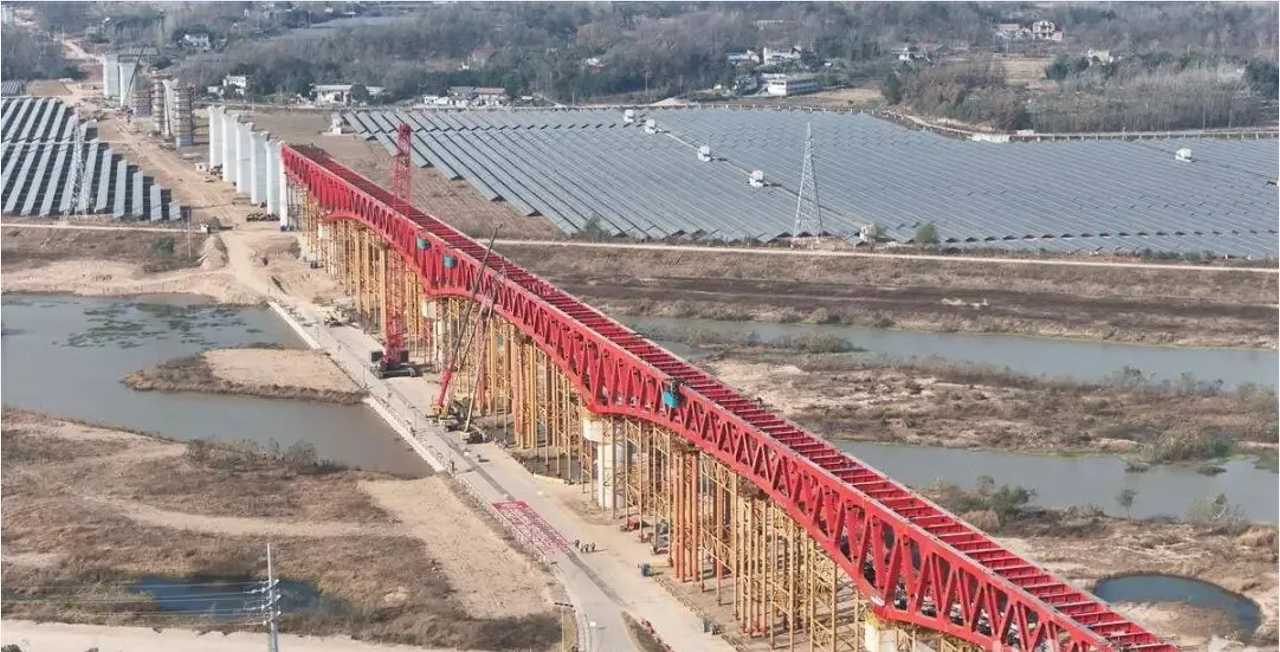 金寨史河特大桥是沪渝蓉高铁合武段的重要控制性工程,全长540米,3个主跨跨越河道,最大跨度达132米。此次合龙一举创下四项“全国第一”:国内高速铁路首座上承式钢桁梁桥、国内高速铁路首座混凝土板——钢桁双结合连续梁桥、国内最大跨度无预应力桥面板连续结合梁桥、国内高速铁路首座长联全焊接连续钢桁梁桥,标志着我国高铁桥梁建设取得重要技术突破。