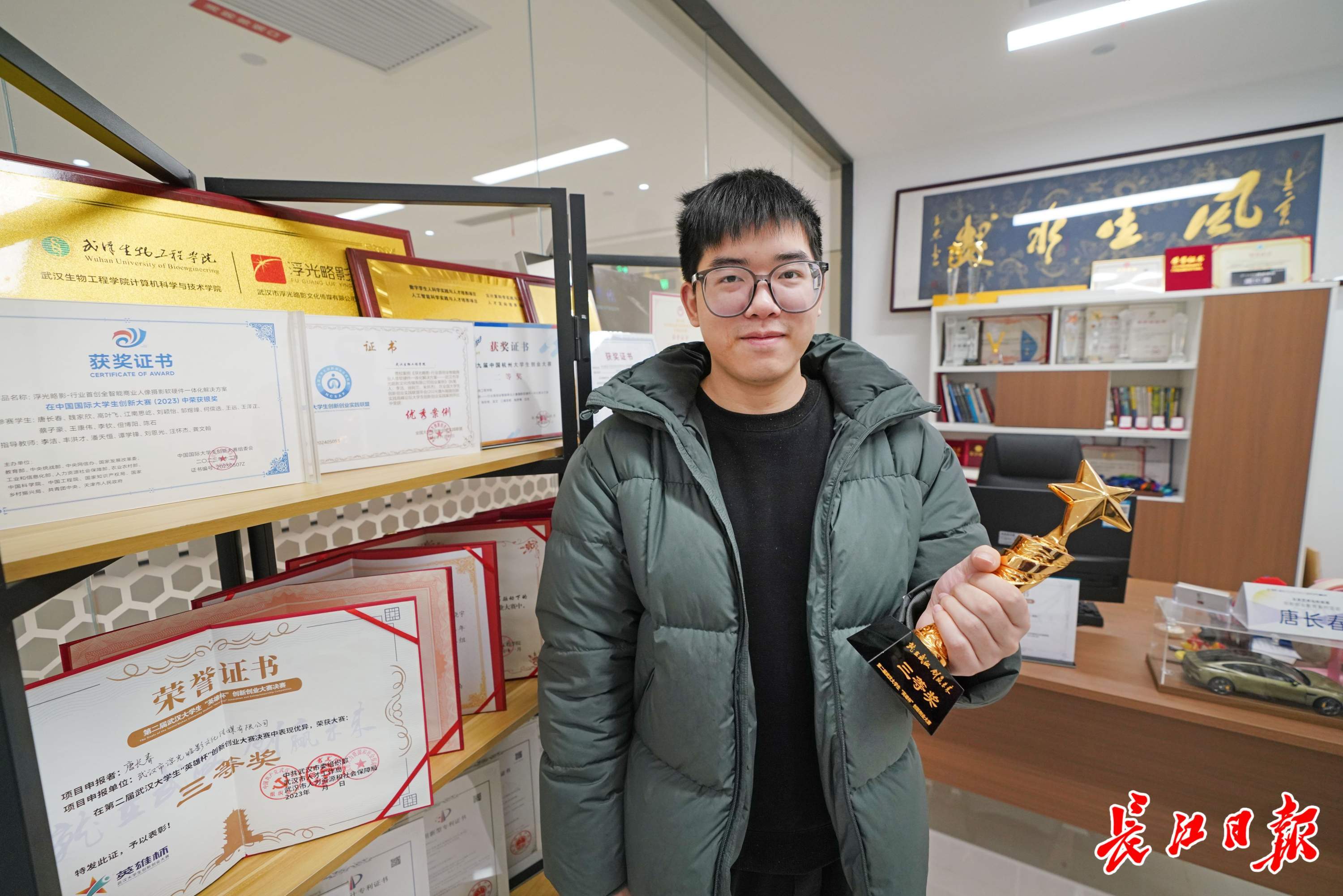 唐长春手握第二届武汉大学生“英雄杯”创新创业大赛奖杯,荣誉证书被放在显眼处。
