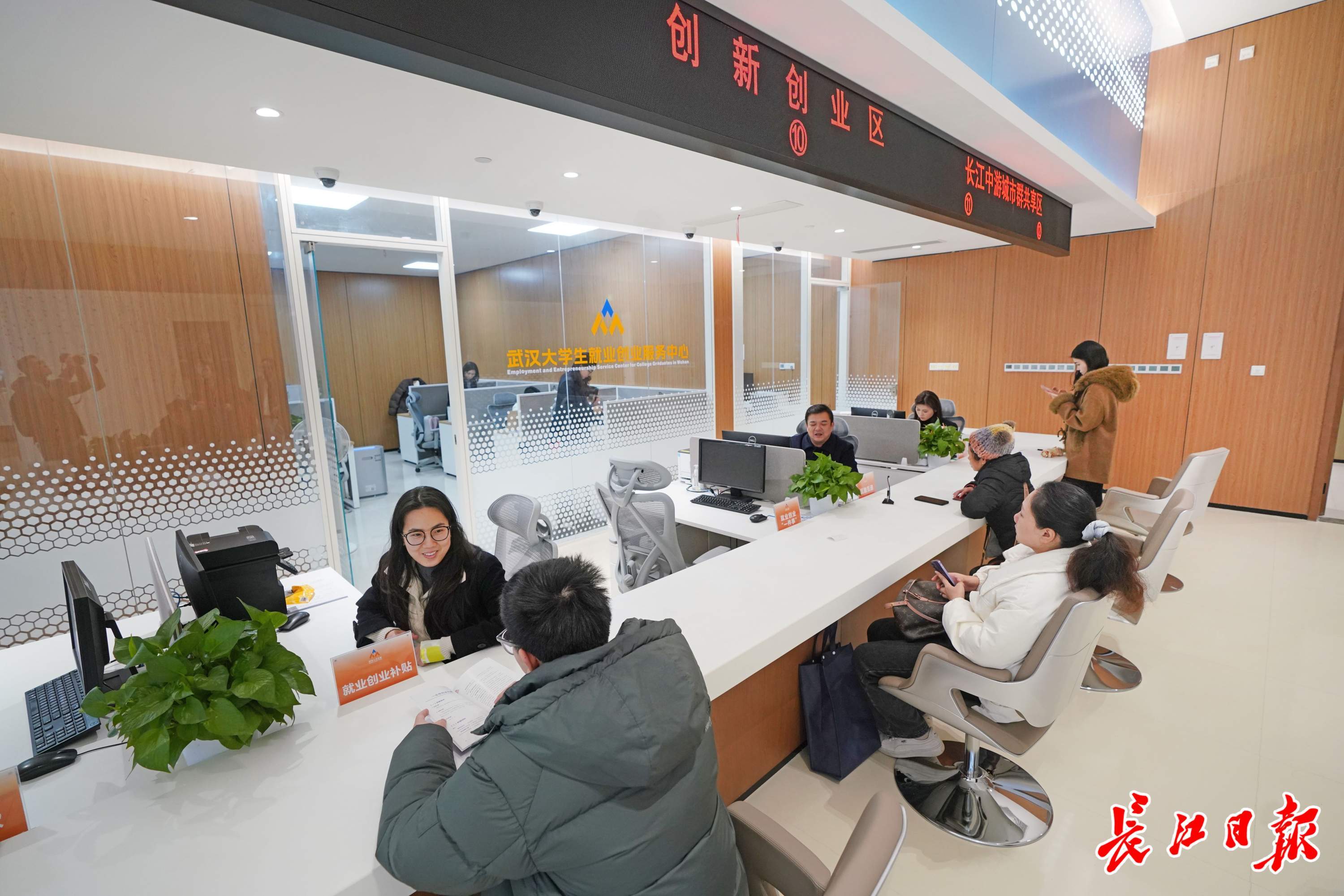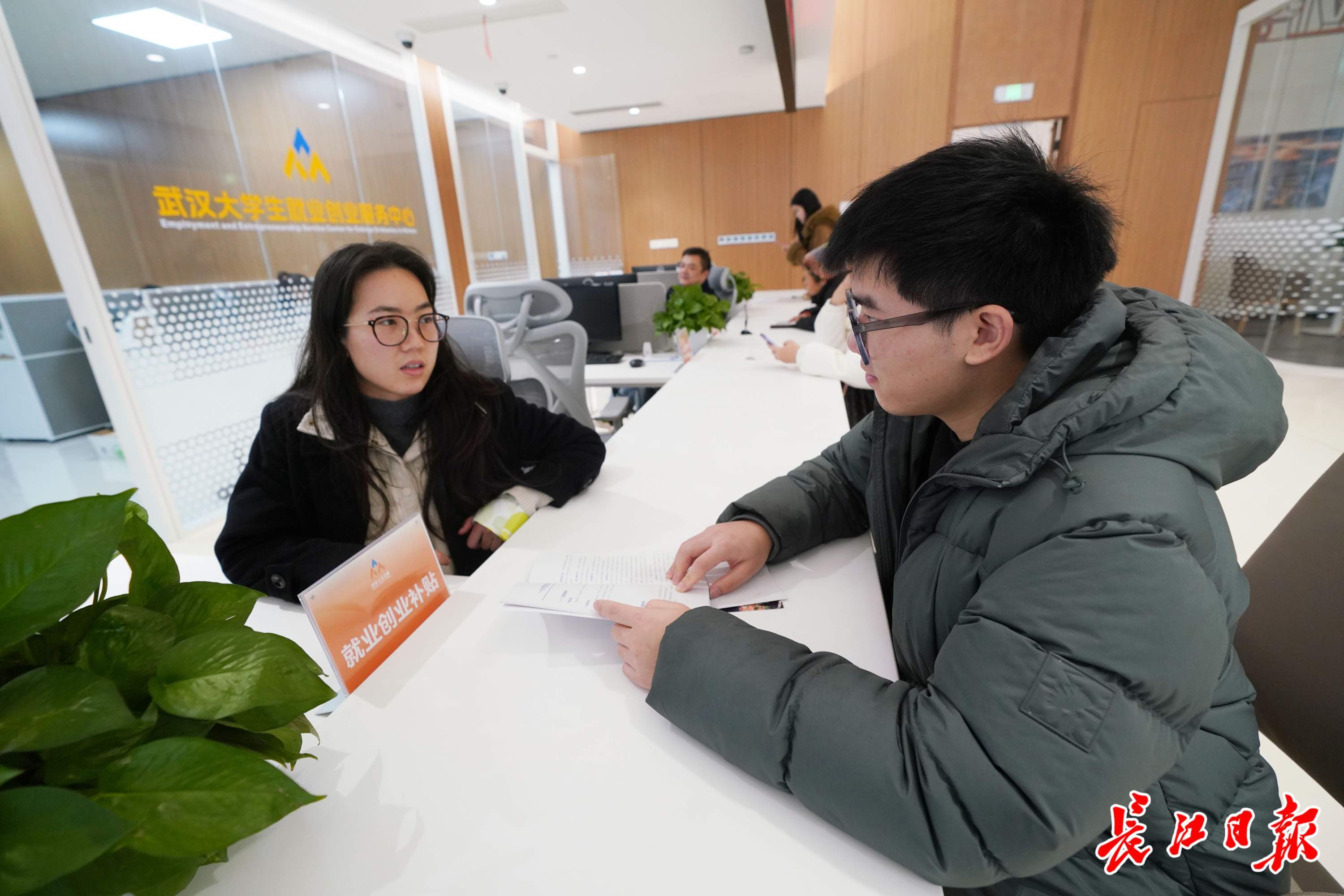 唐长春(右一)在武汉人才之家一楼服务岛台咨询相关政策。