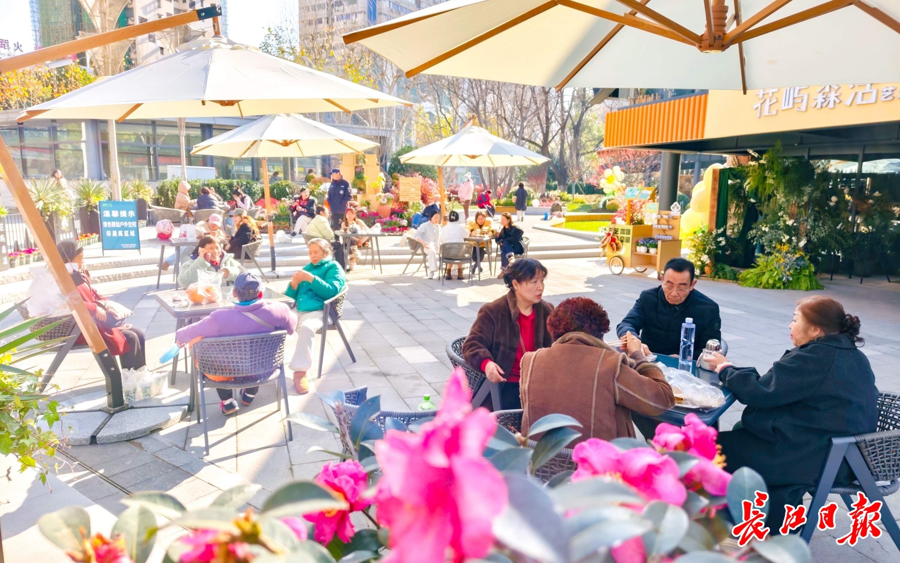 元旦当天,武汉理工大学大一学生卢俊怡、吴师锐到汉口解放公园赏蜡梅,从黄浦路地铁站H出口一出来,发现花屿森活绿色驿站正式迎客,她们连忙进去“尝鲜”。“这里真是太美了!”卢俊怡由衷赞叹。